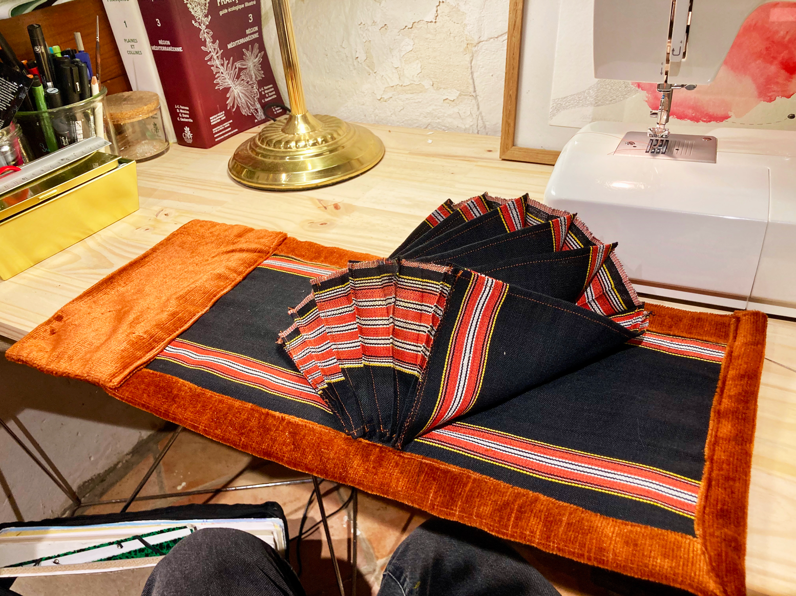 Réalisation d'une pochette pour classer des photographies en tissus chinés et réemployés.