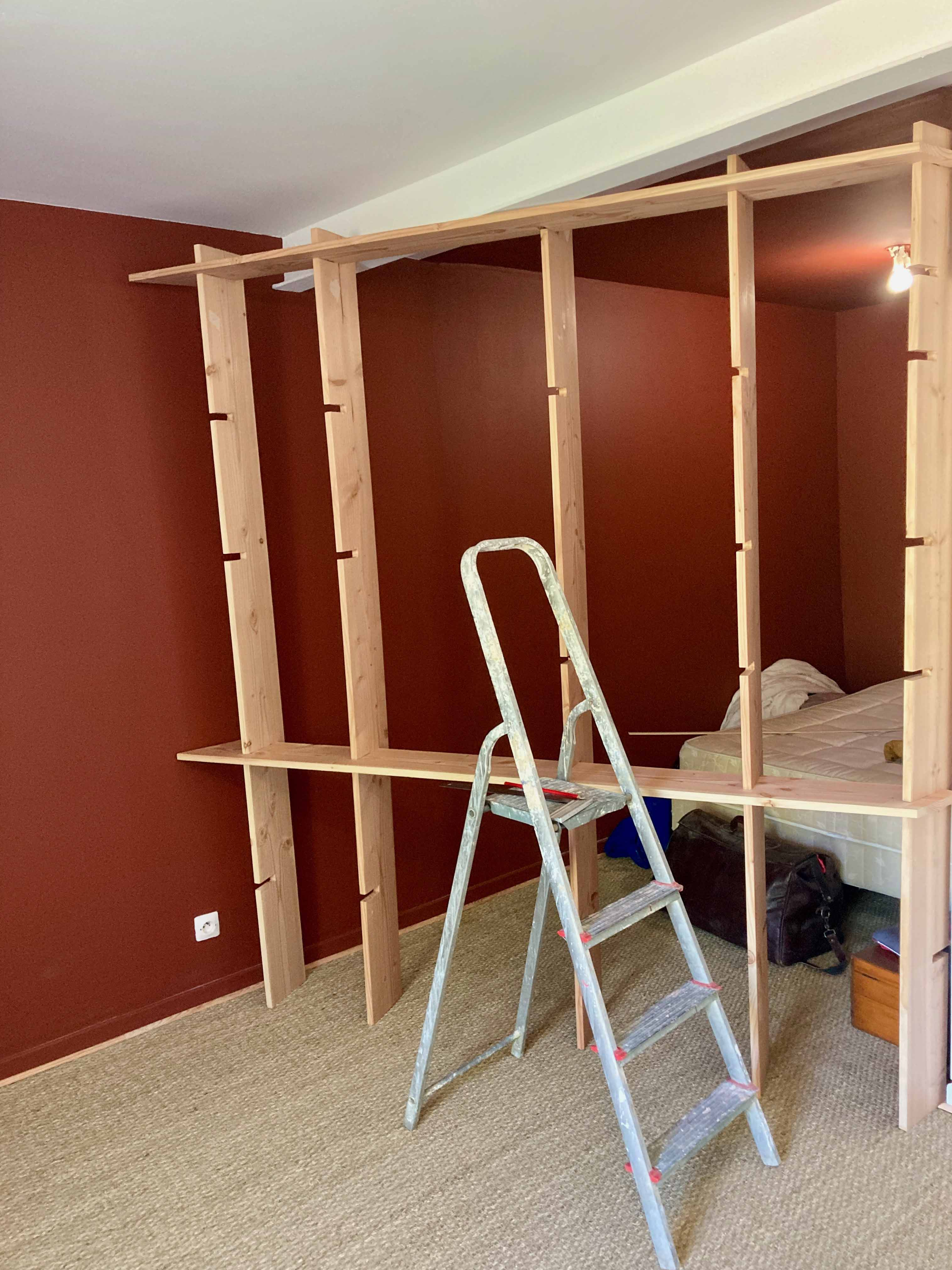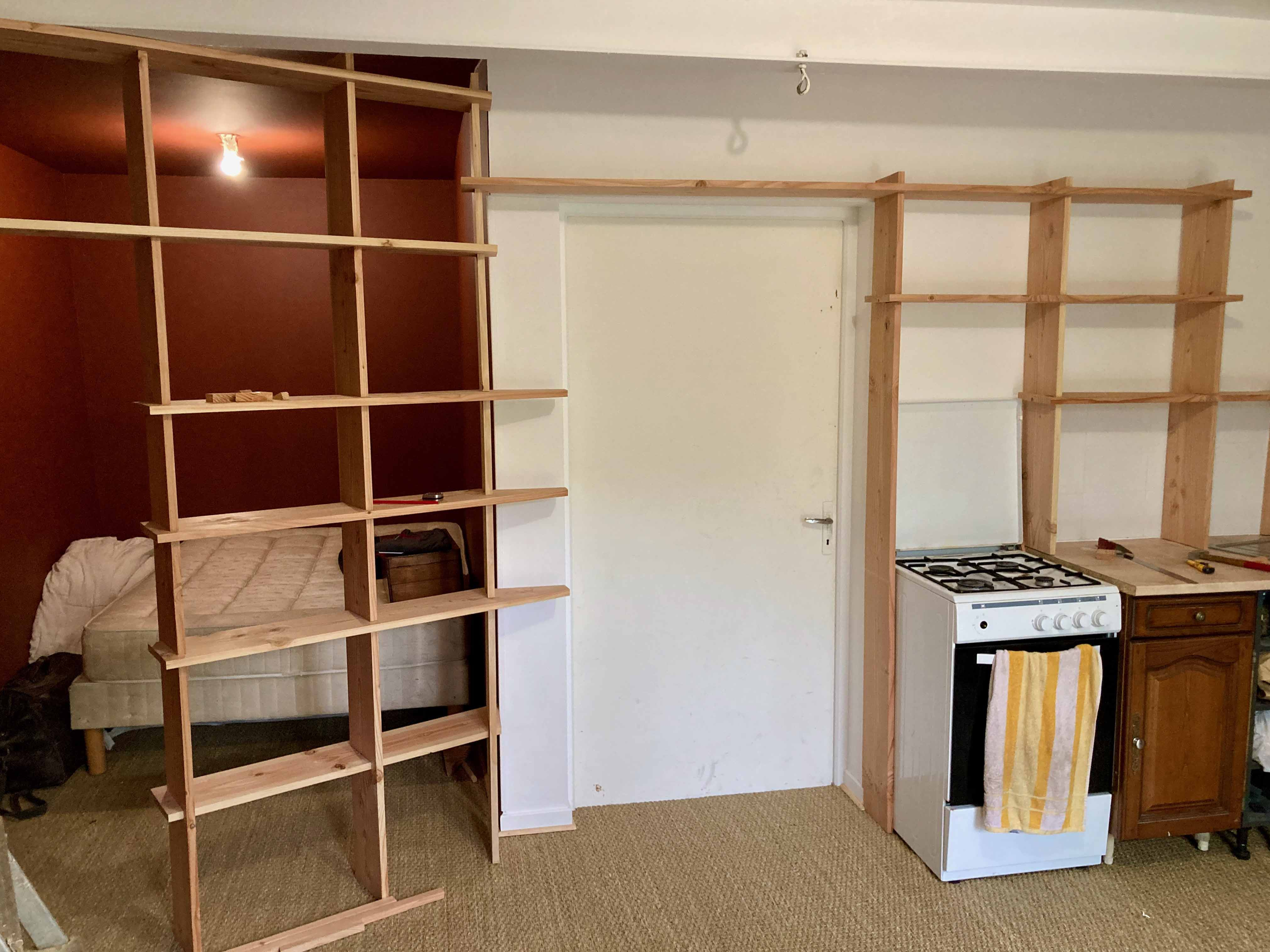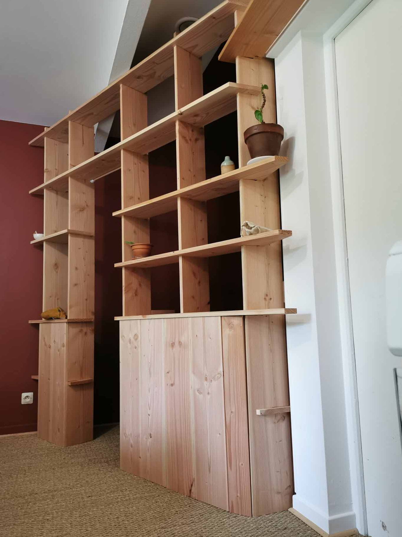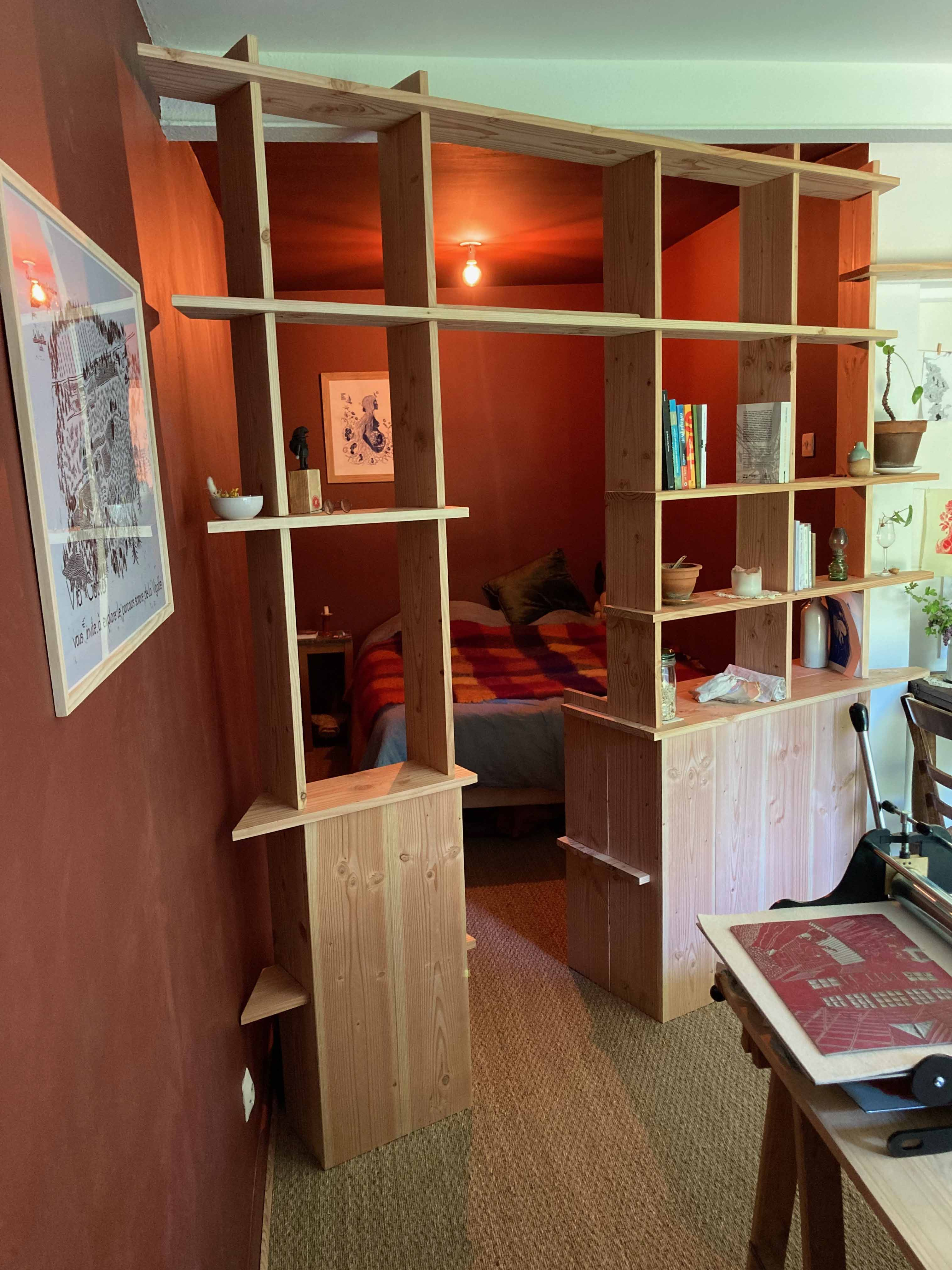 Réalisation d'un agencement bois dans un studio. Bibliothèque, parois, cuisine et salle de bain d'un seul tenant. Assemblage par emboitage, sans aucune visserie. Pin Douglas.