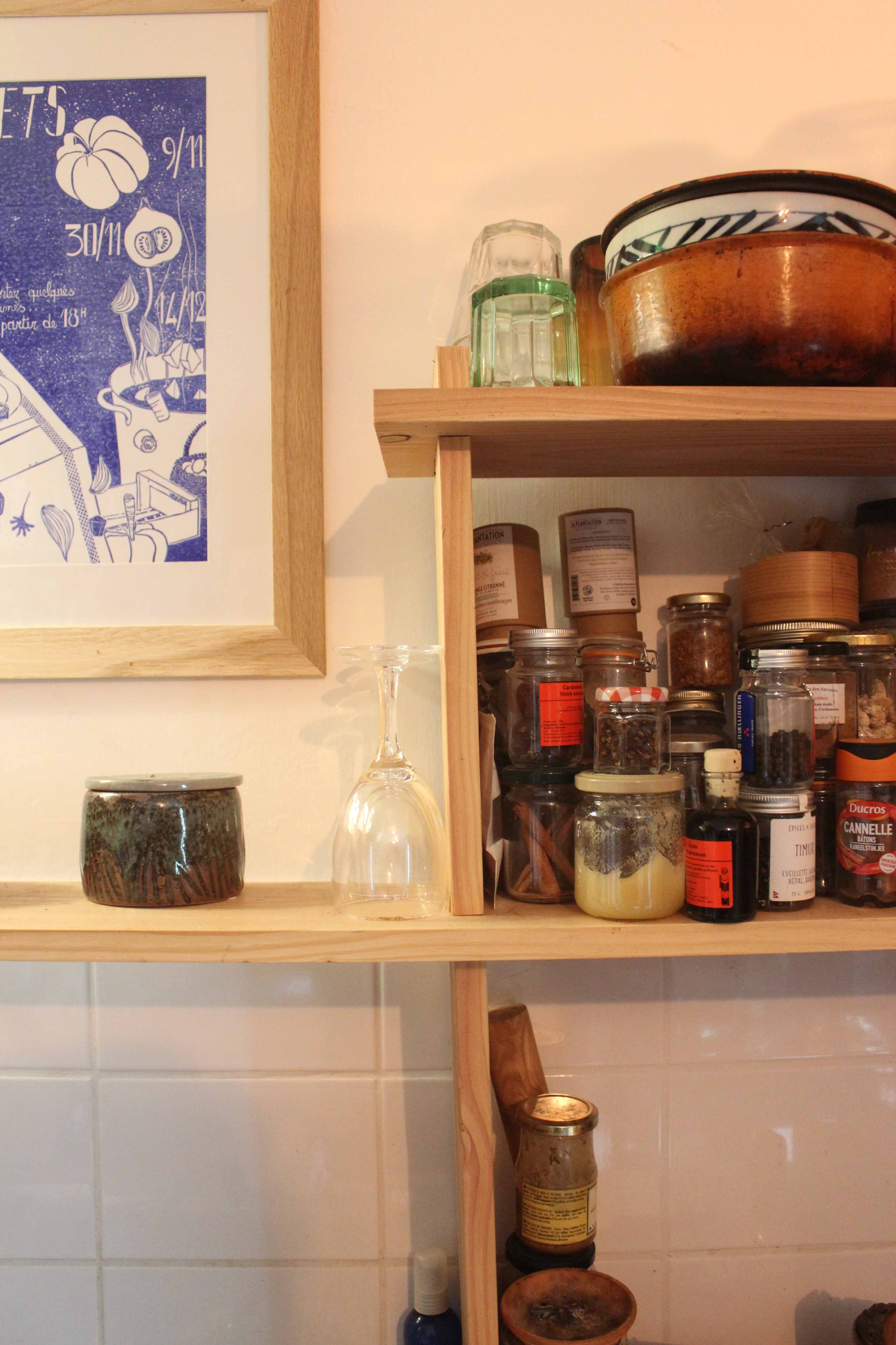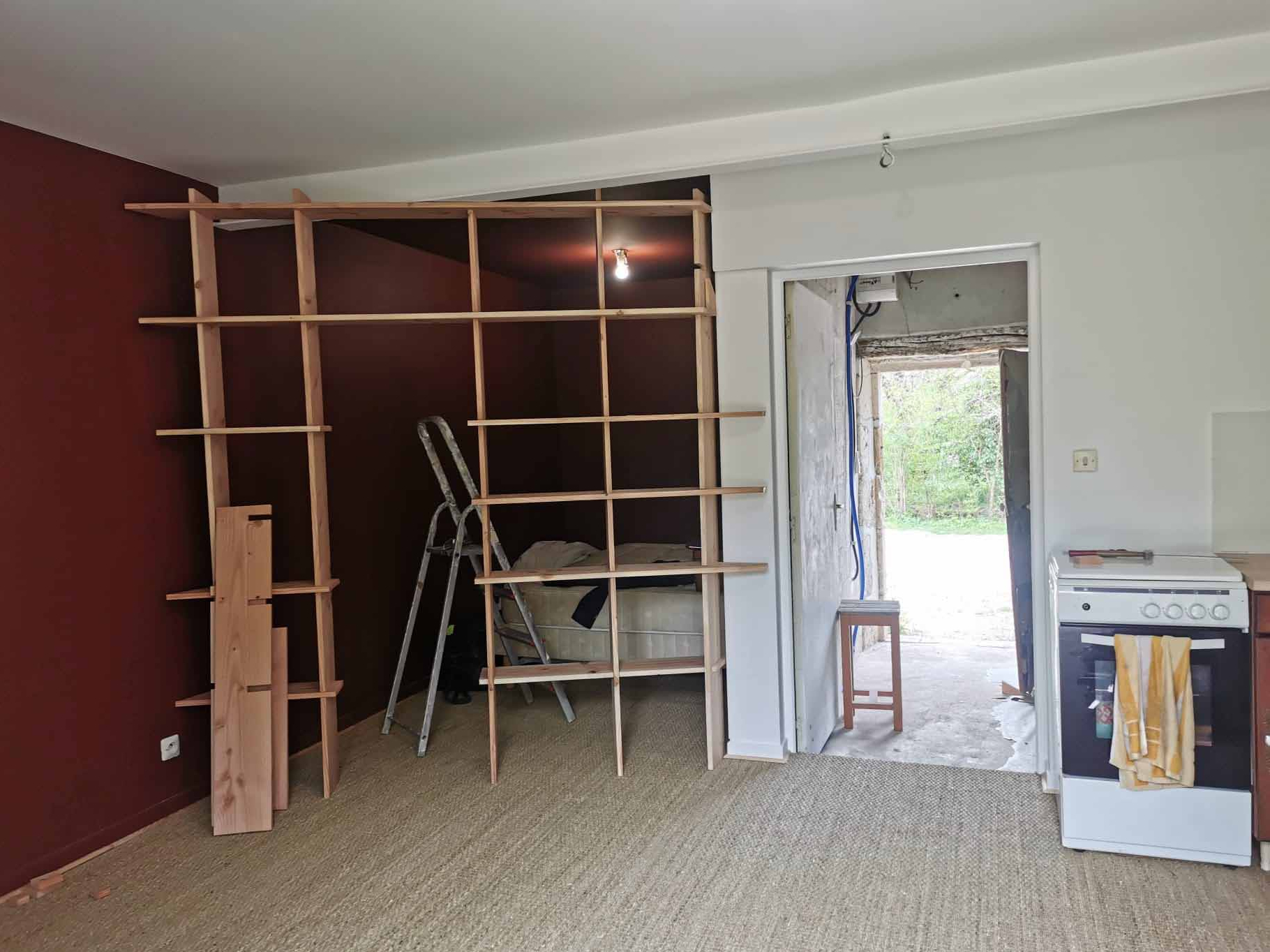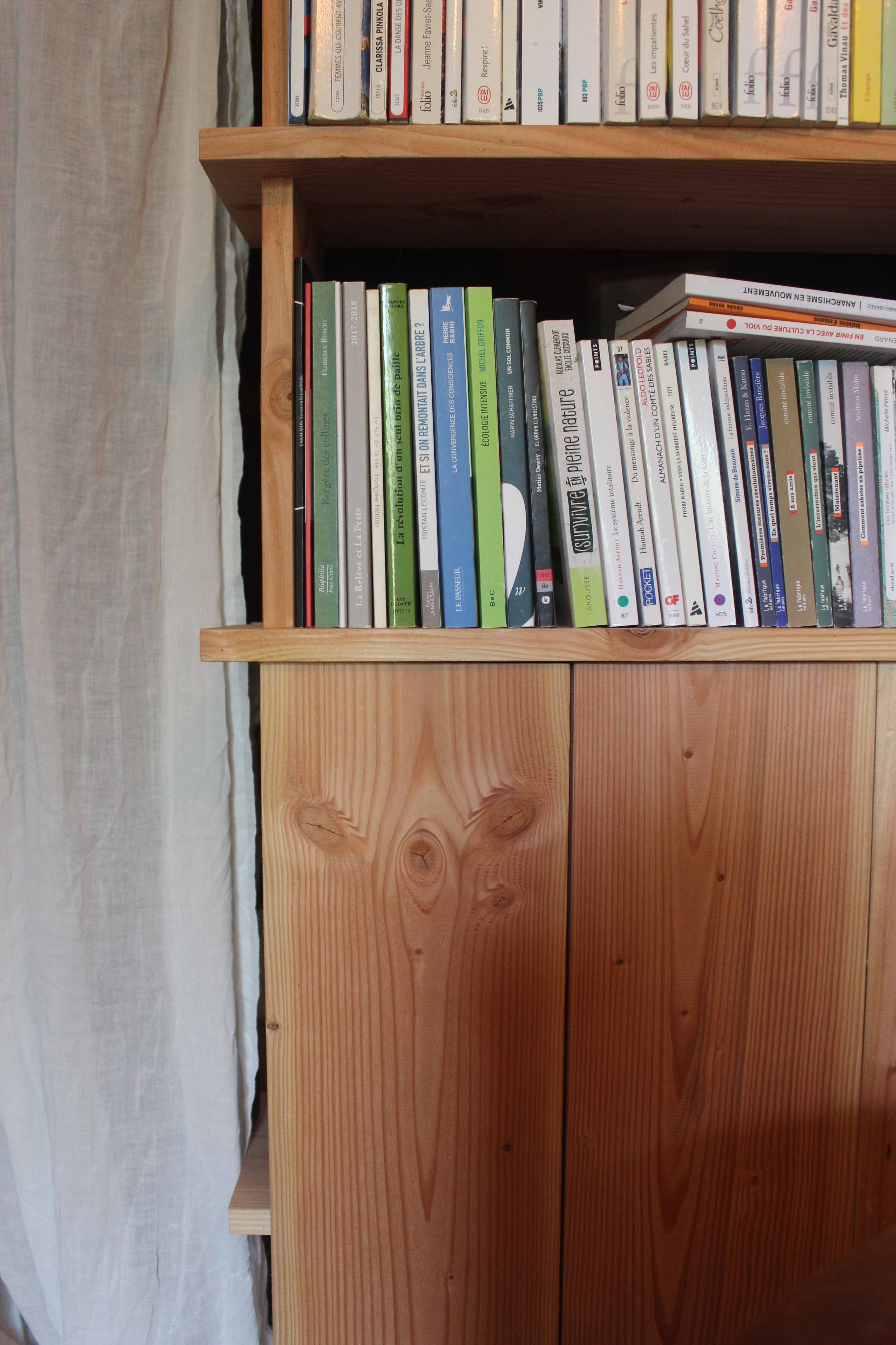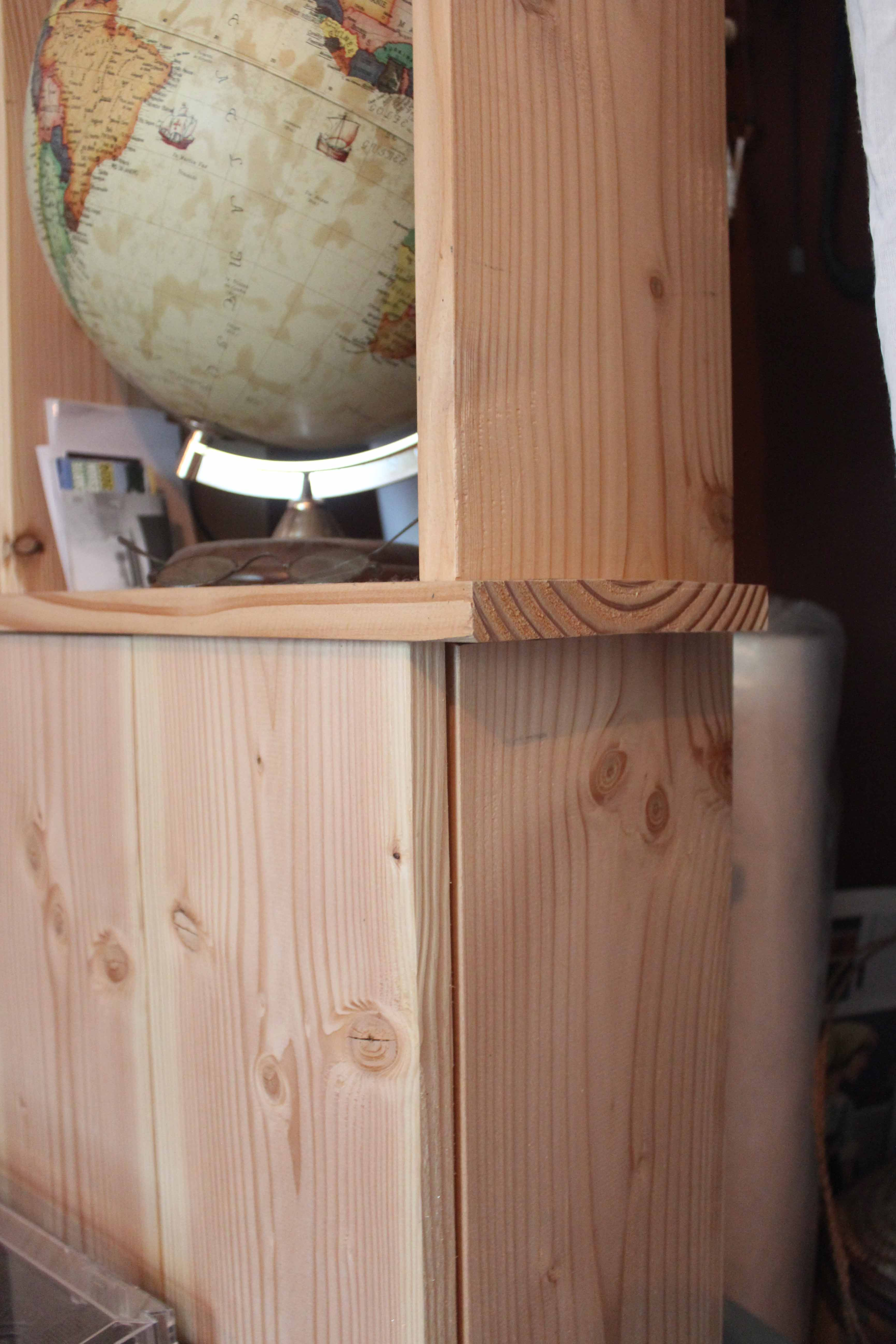 Réalisation d'un agencement bois dans un studio. Bibliothèque, parois, cuisine et salle de bain d'un seul tenant. Assemblage par emboitage, sans aucune visserie. Pin Douglas.