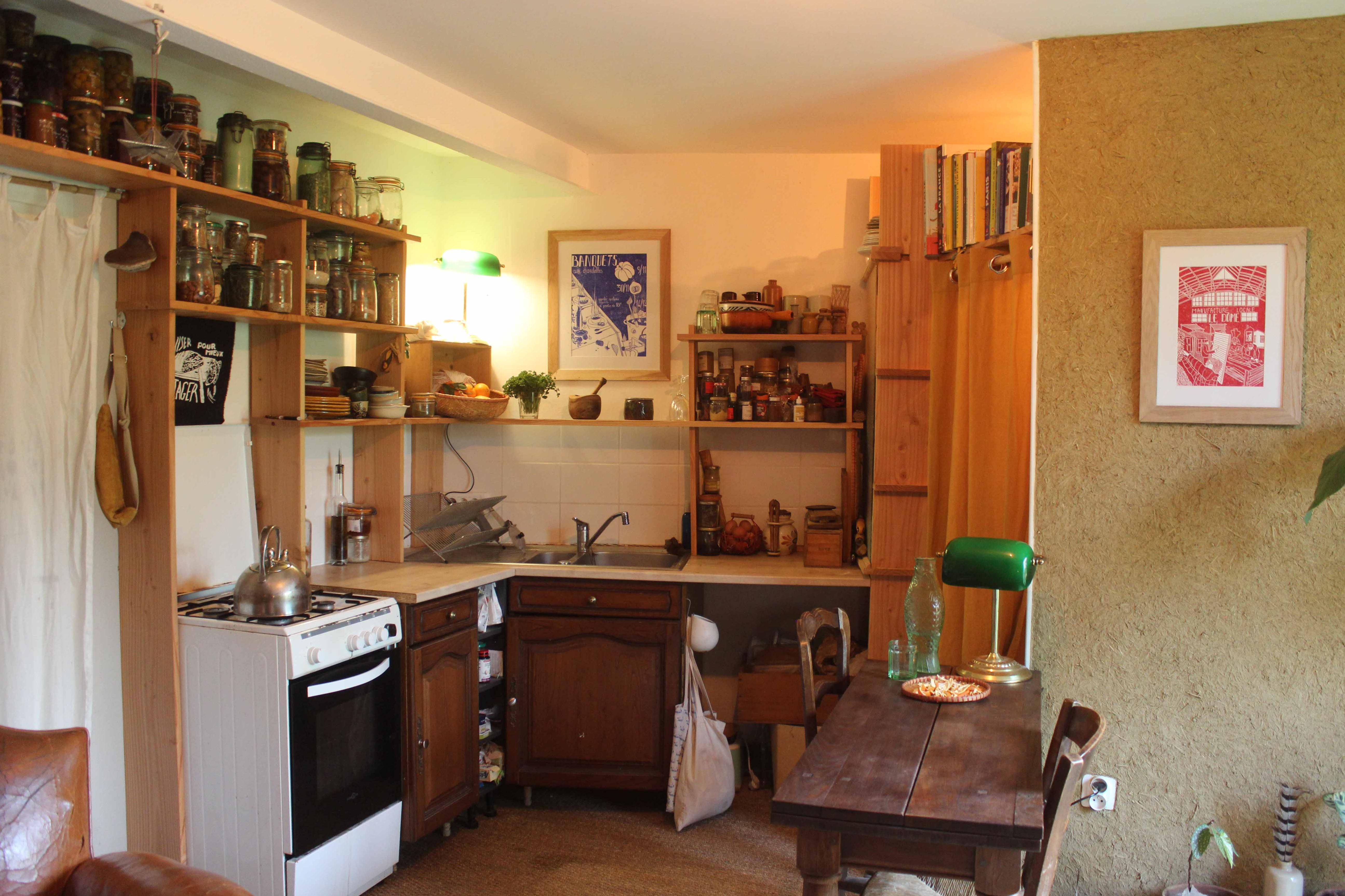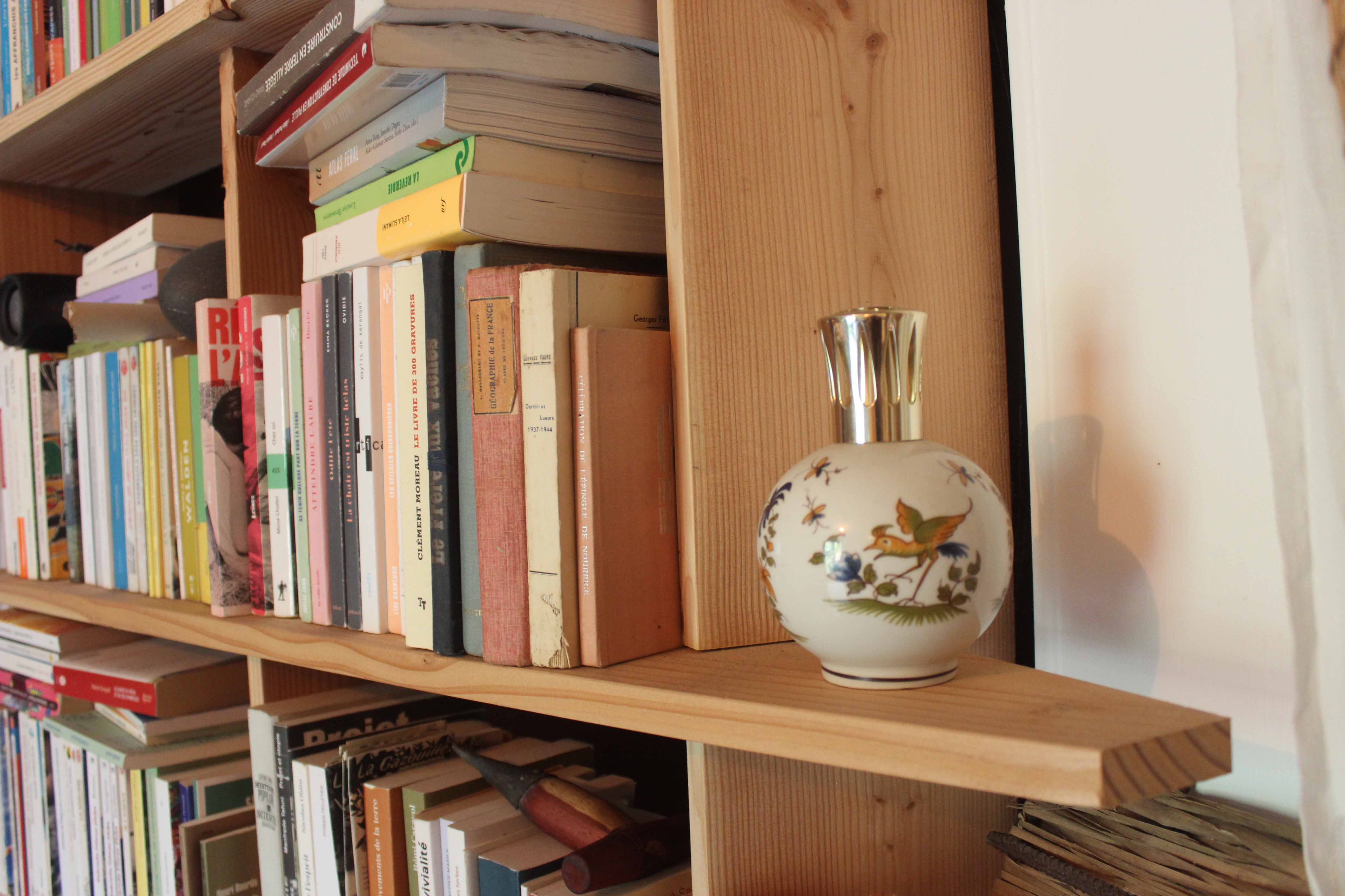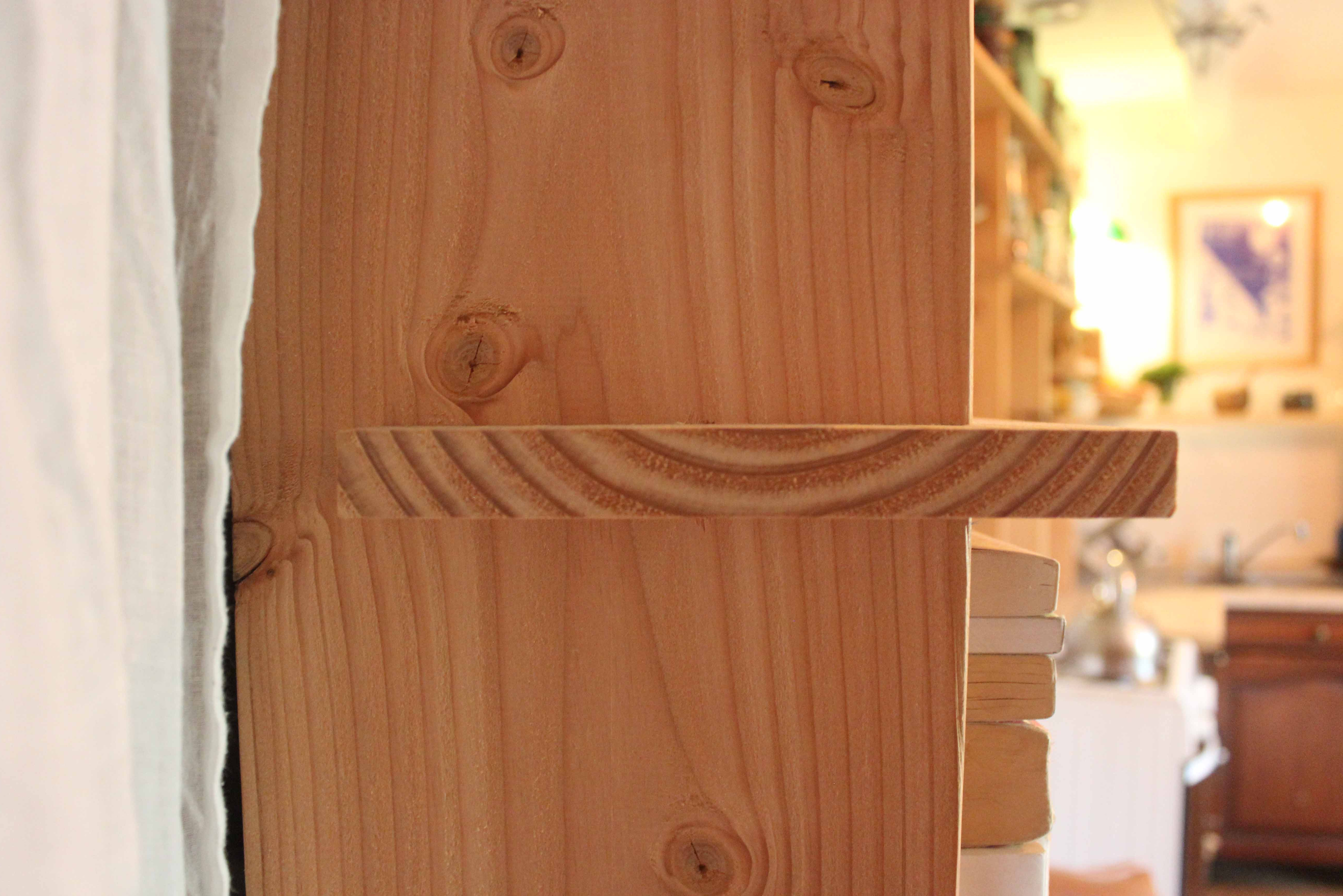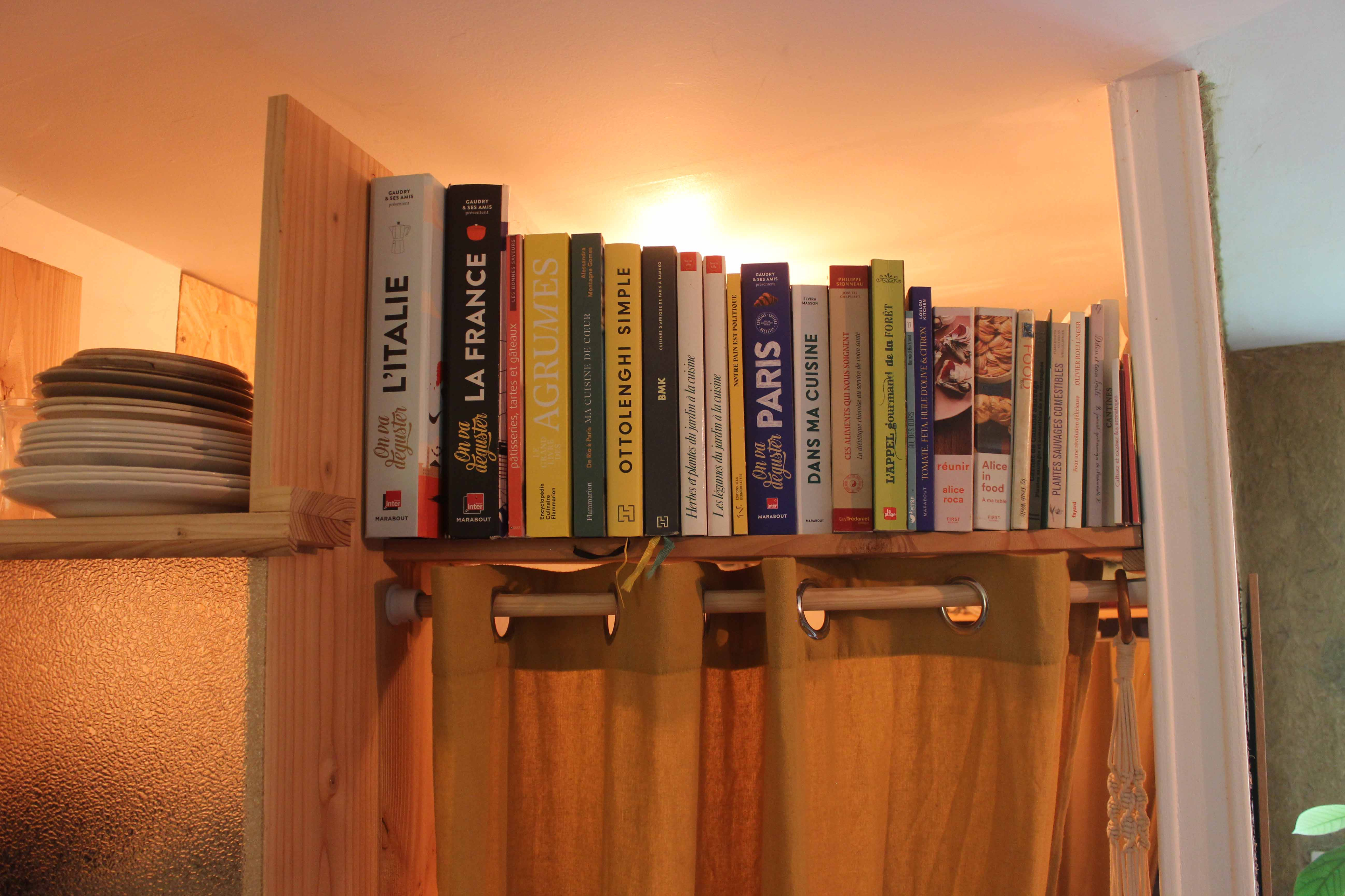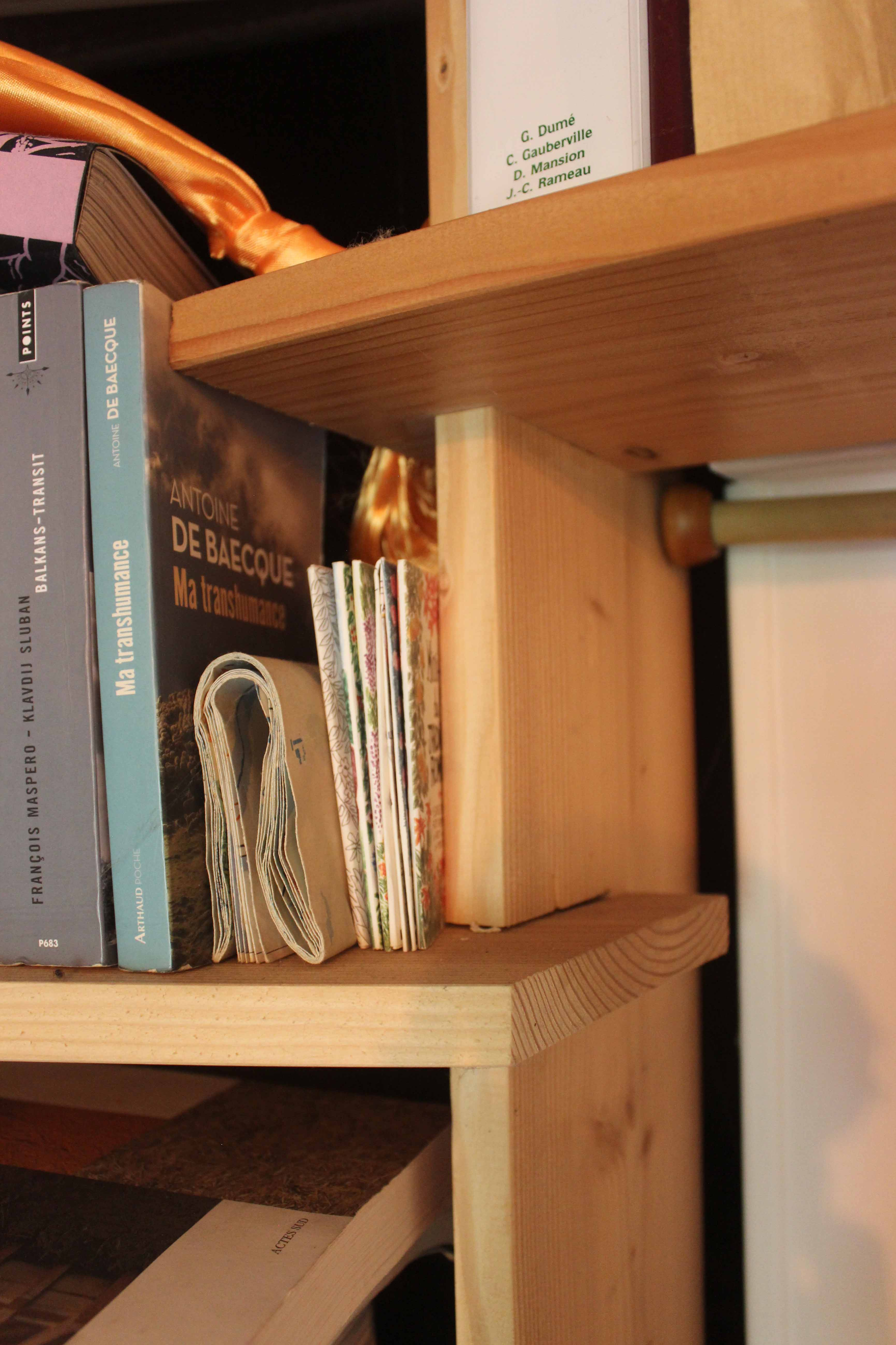 Réalisation d'un agencement bois dans un studio. Bibliothèque, parois, cuisine et salle de bain d'un seul tenant. Assemblage par emboitage, sans aucune visserie. Pin Douglas.