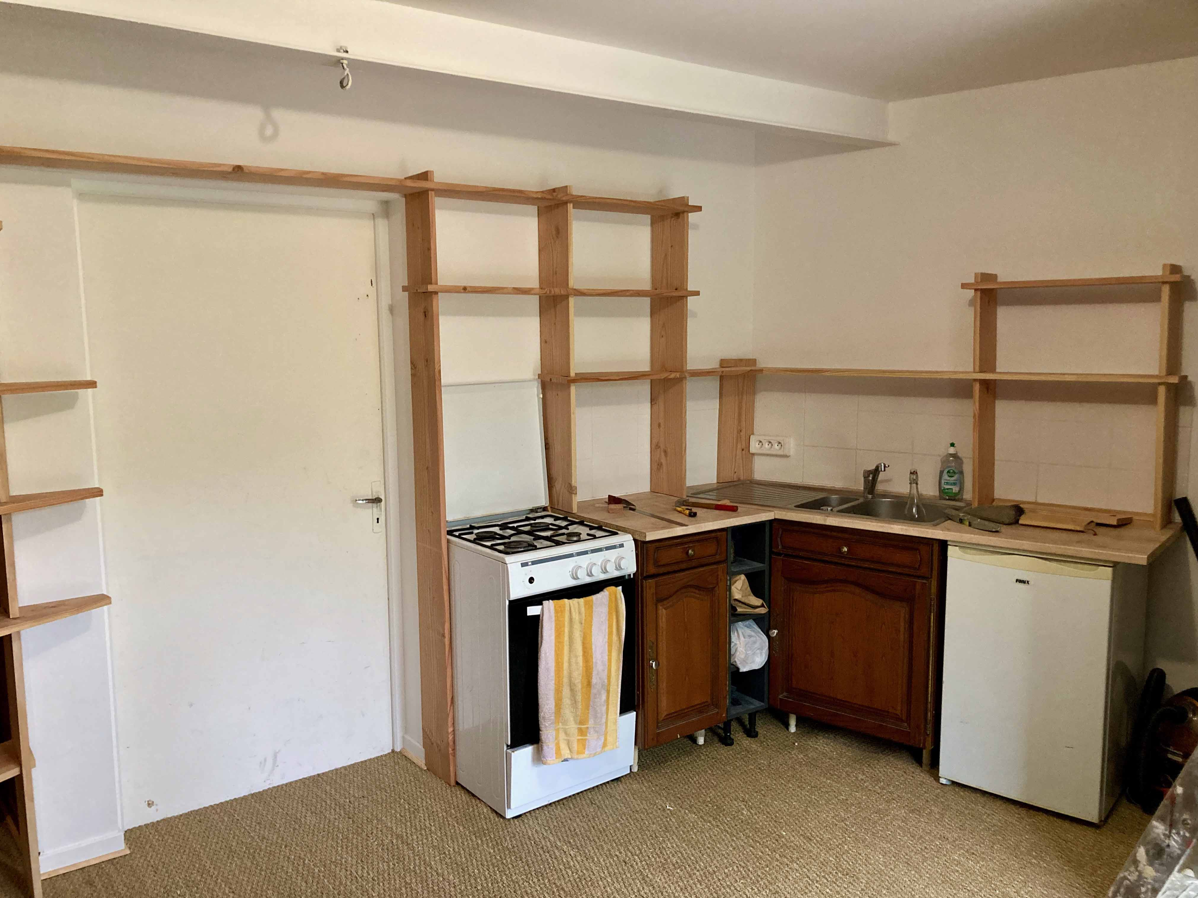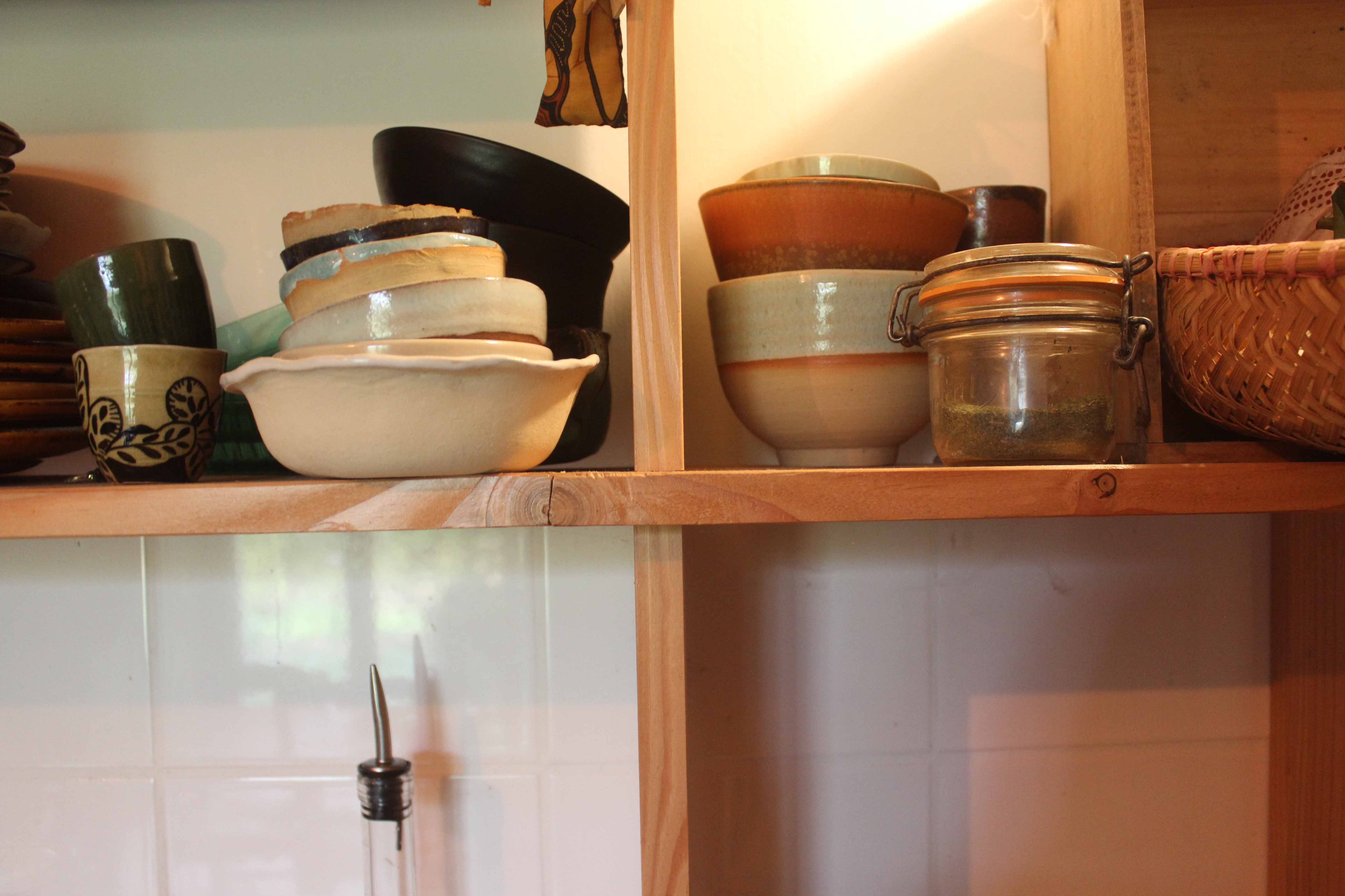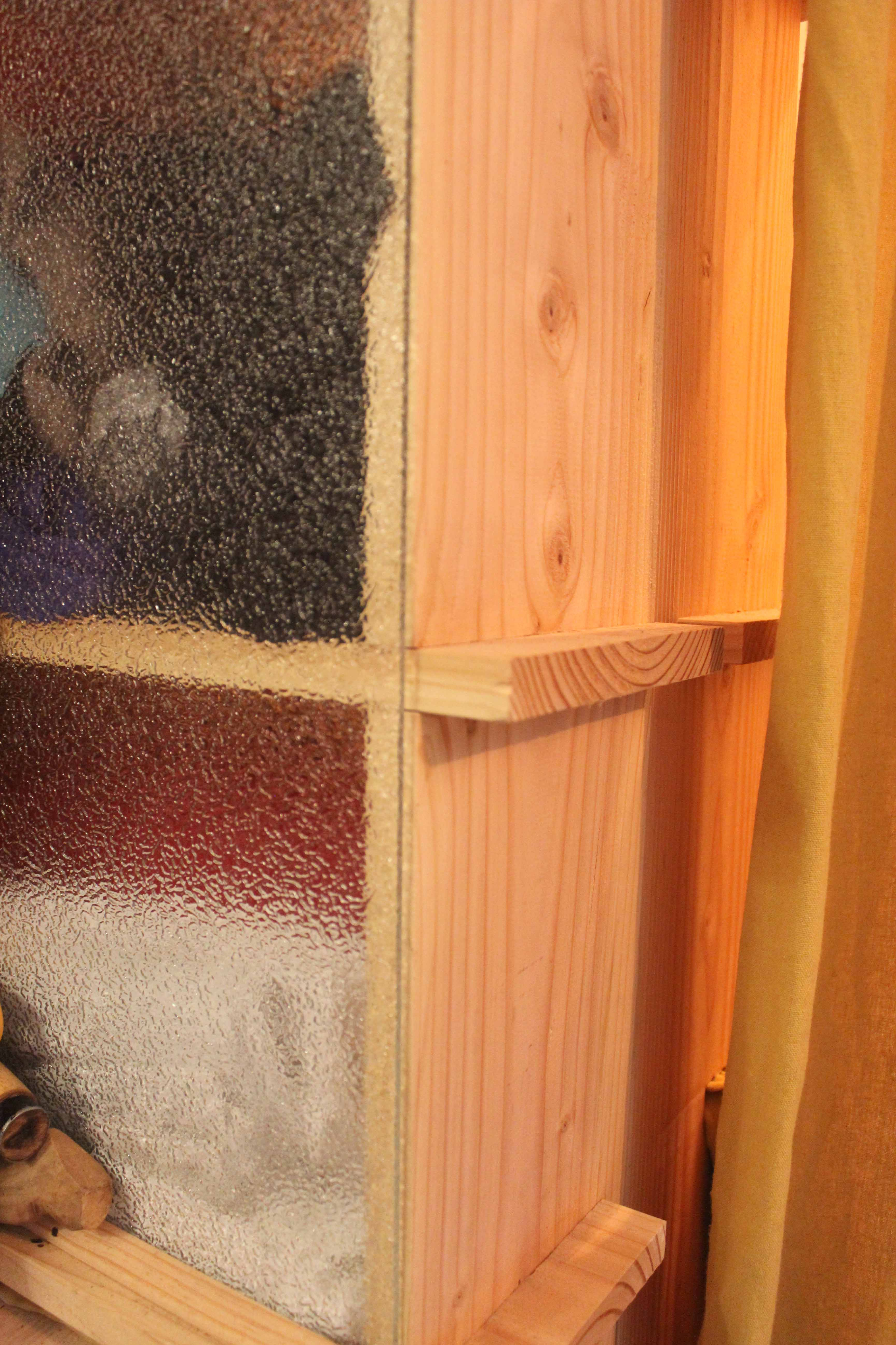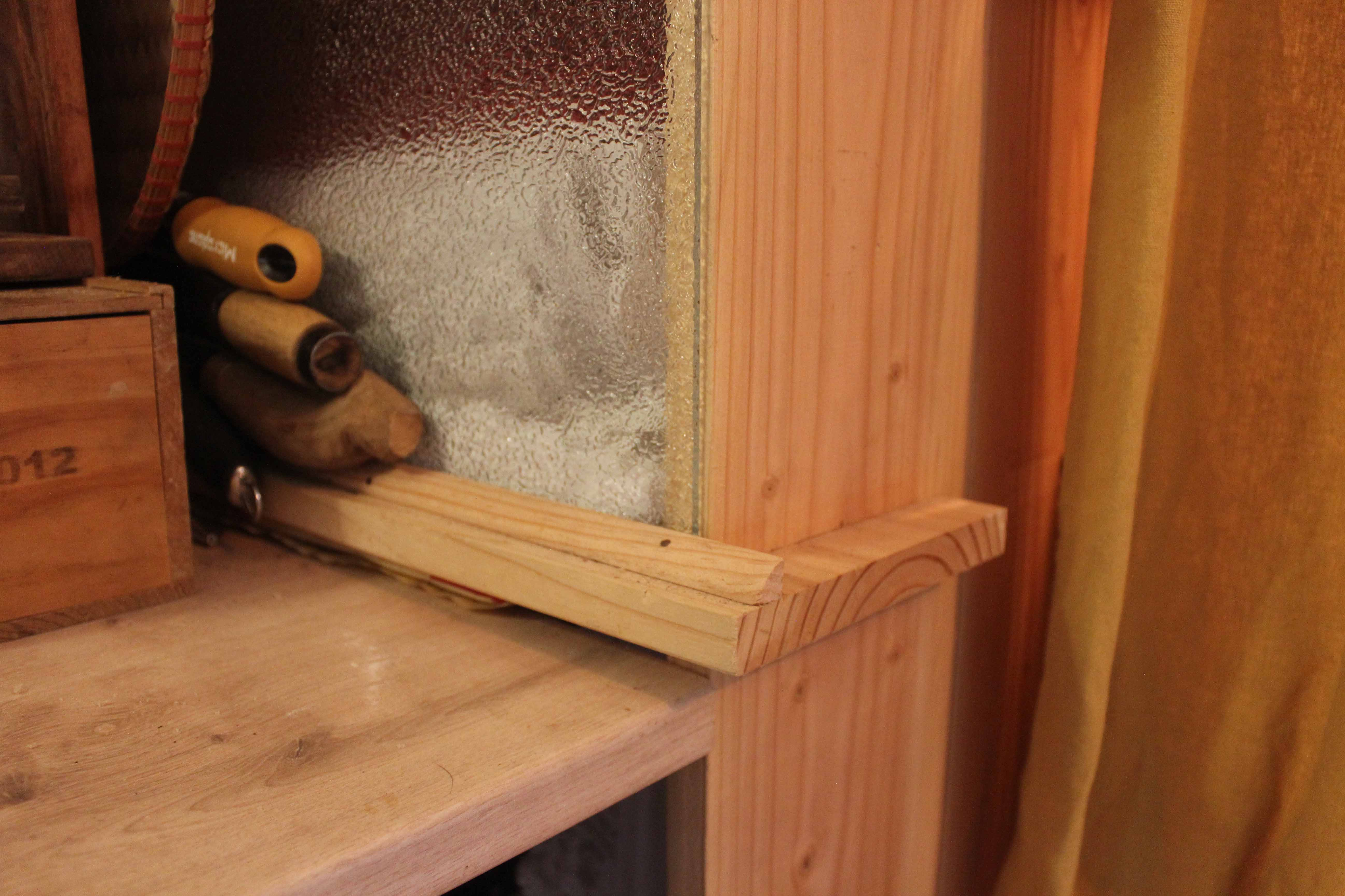 Réalisation d'un agencement bois dans un studio. Bibliothèque, parois, cuisine et salle de bain d'un seul tenant. Assemblage par emboitage, sans aucune visserie. Pin Douglas.