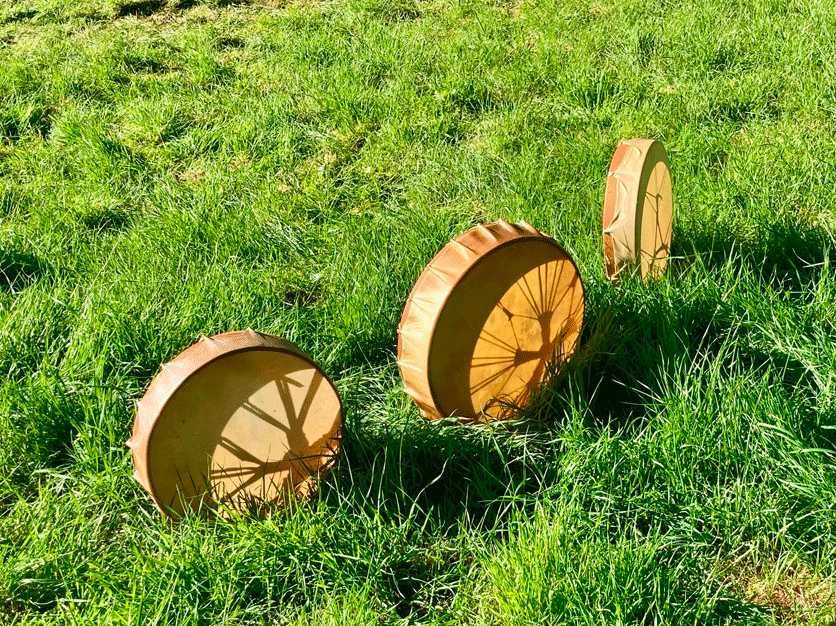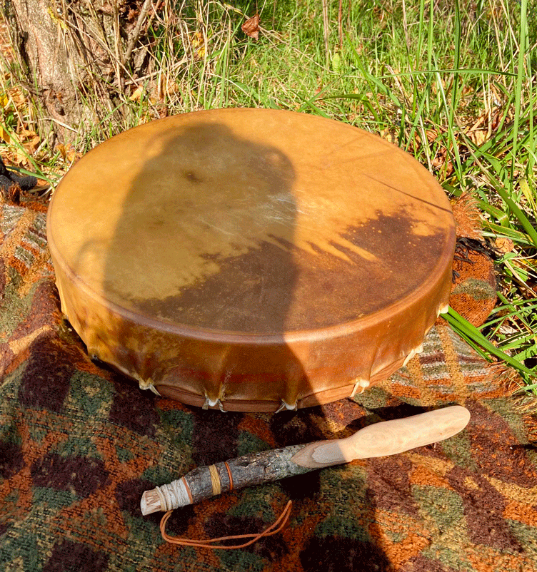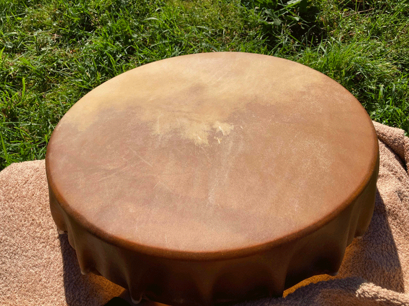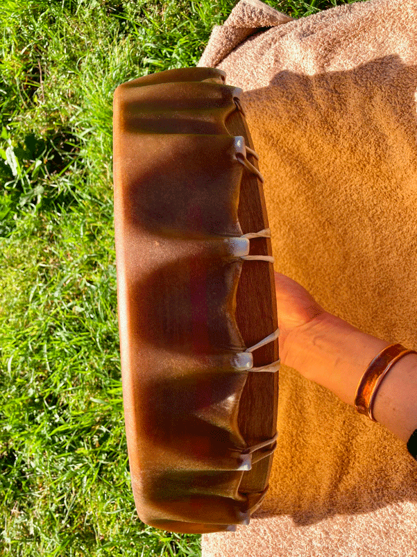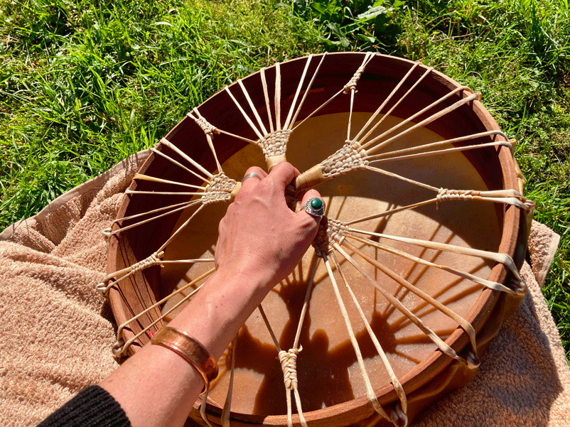 Réalisation d'un tambour mongole en peau animale et bois d'orme. Sculture de la mochilla en bois de chataigner touché par la foudre et fibres végétales.