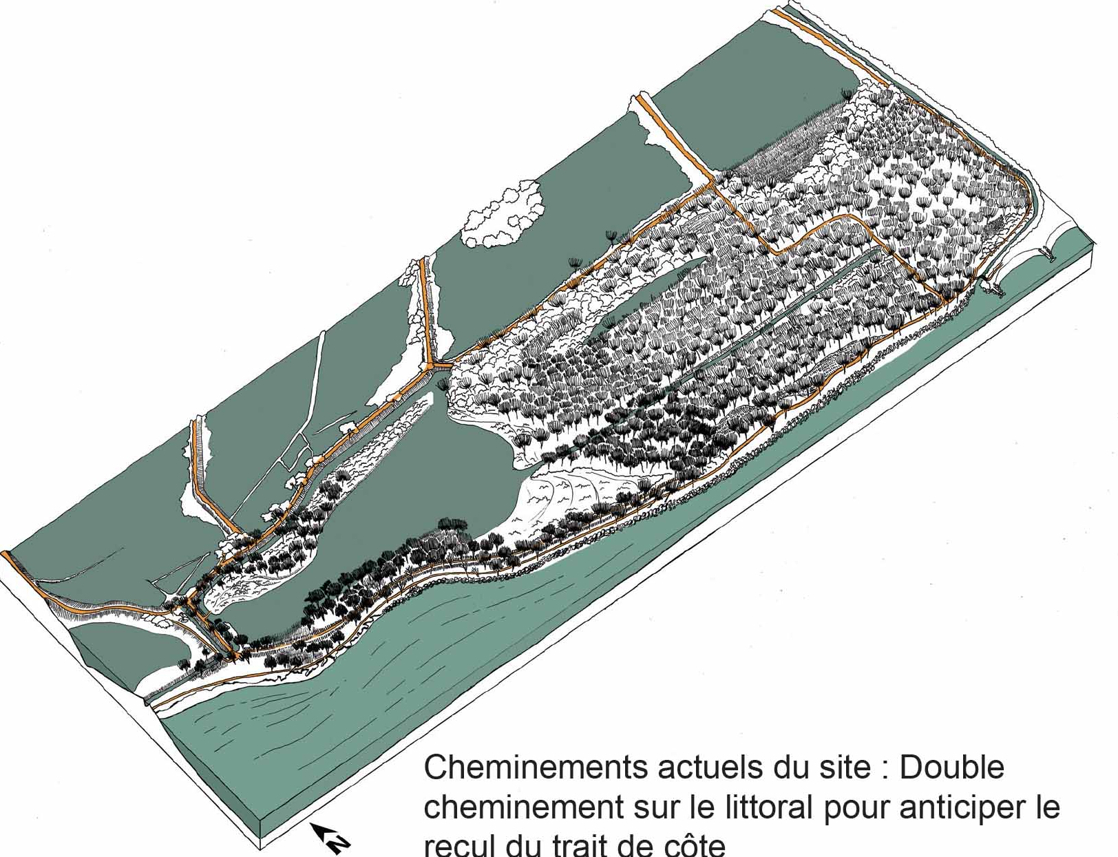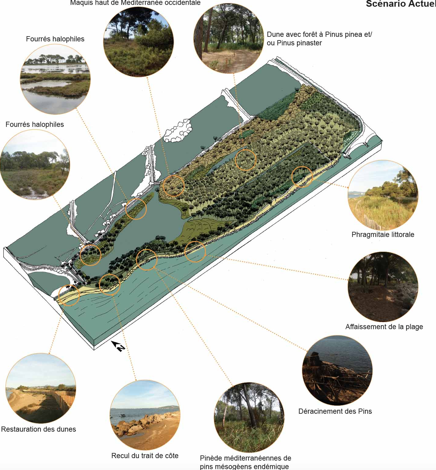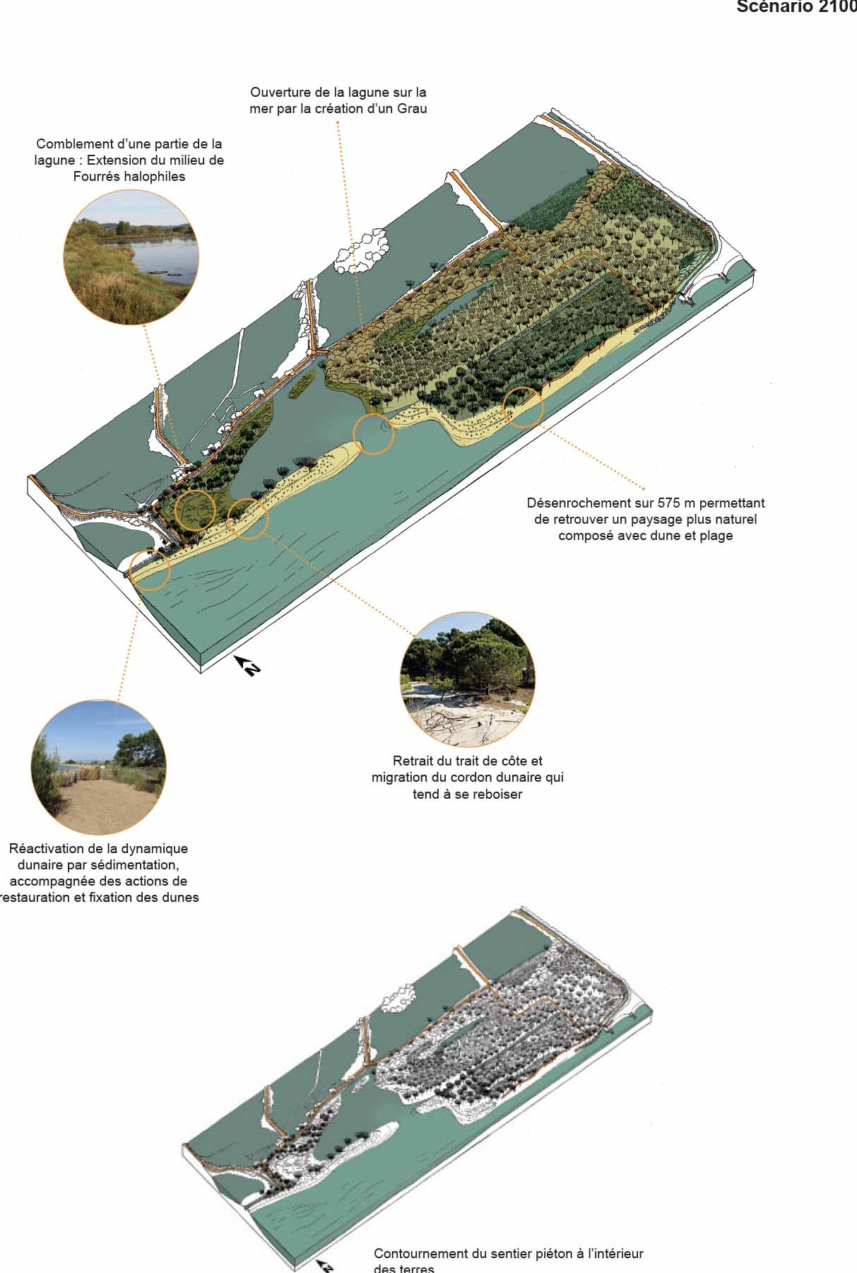 Retransription et scénarisation des évolutions paysagères et environnementales des Vieux Salins à Hyères en fonction de l’évolution du trait de côte et de la suppression des enrochements qui entrainent une modification de milieux